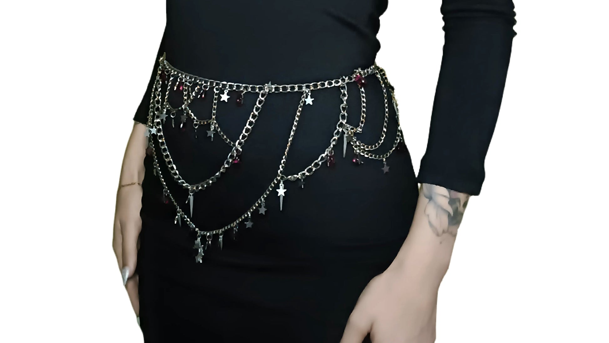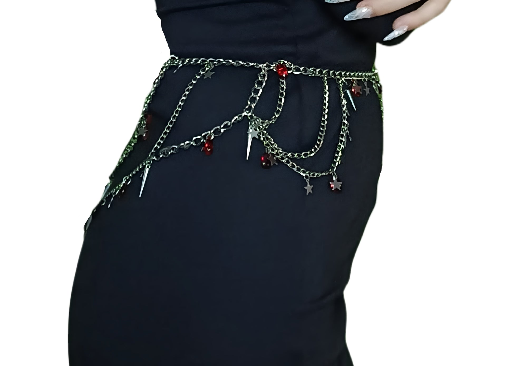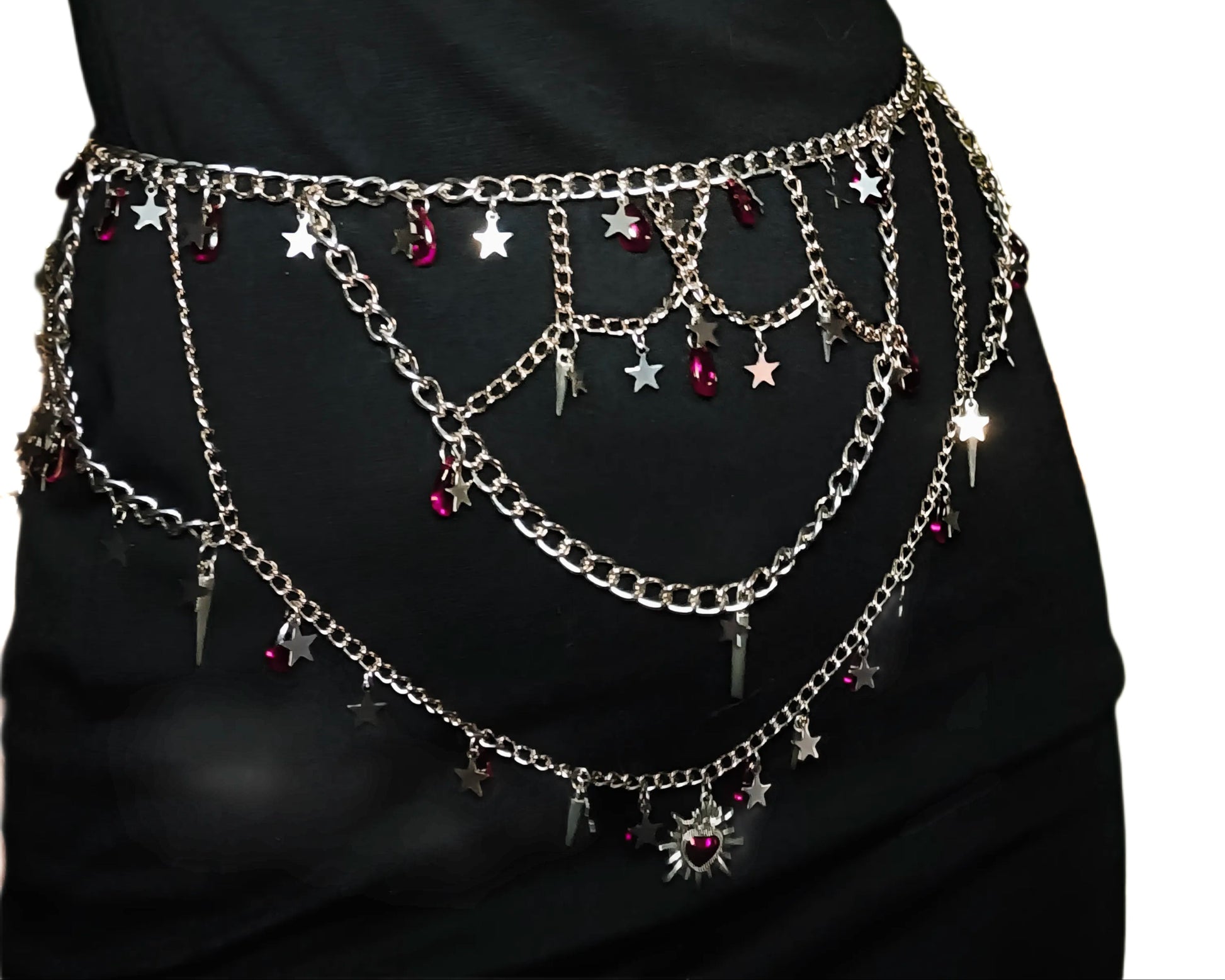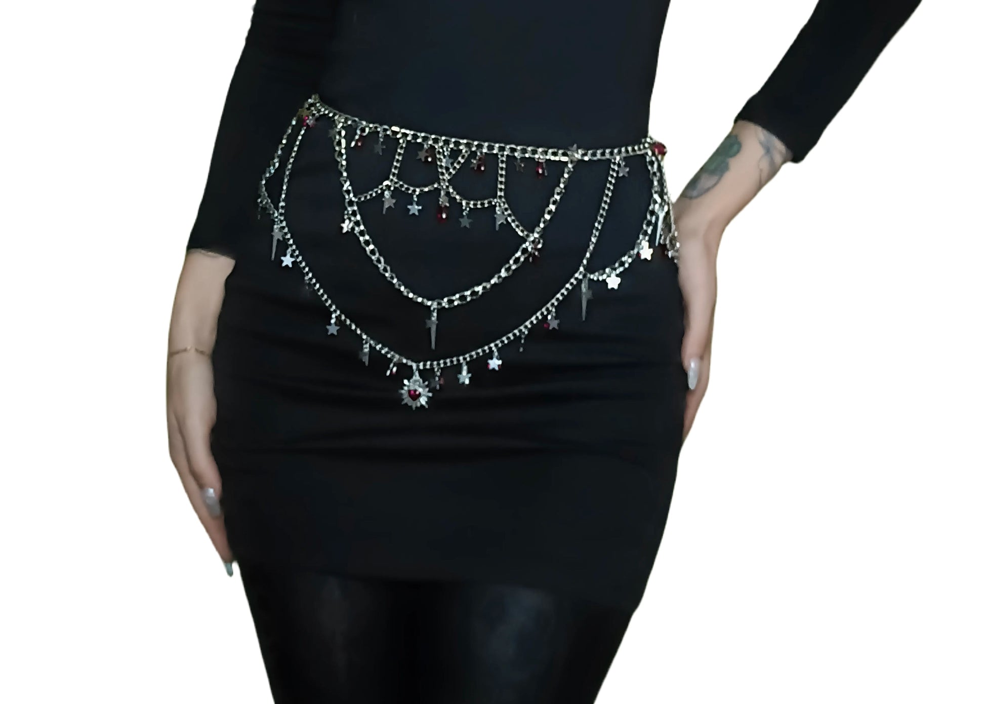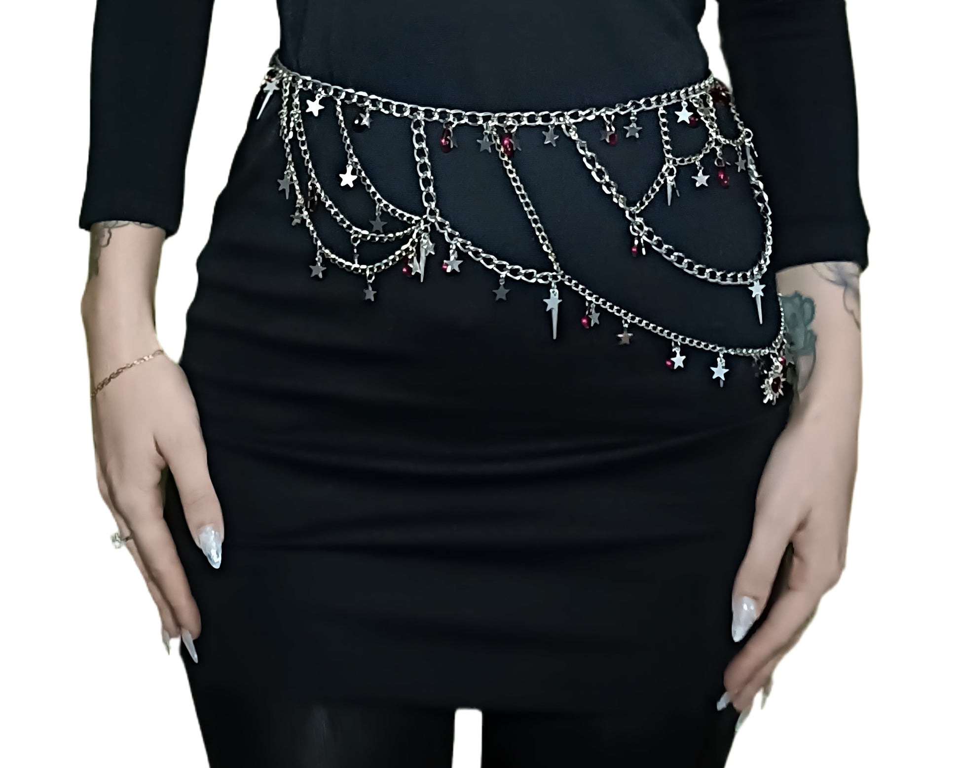 Hergestellt aus Edelstahlketten und O-Ringen, verziert mit rubinroten Perlen und kleinen Sternen.