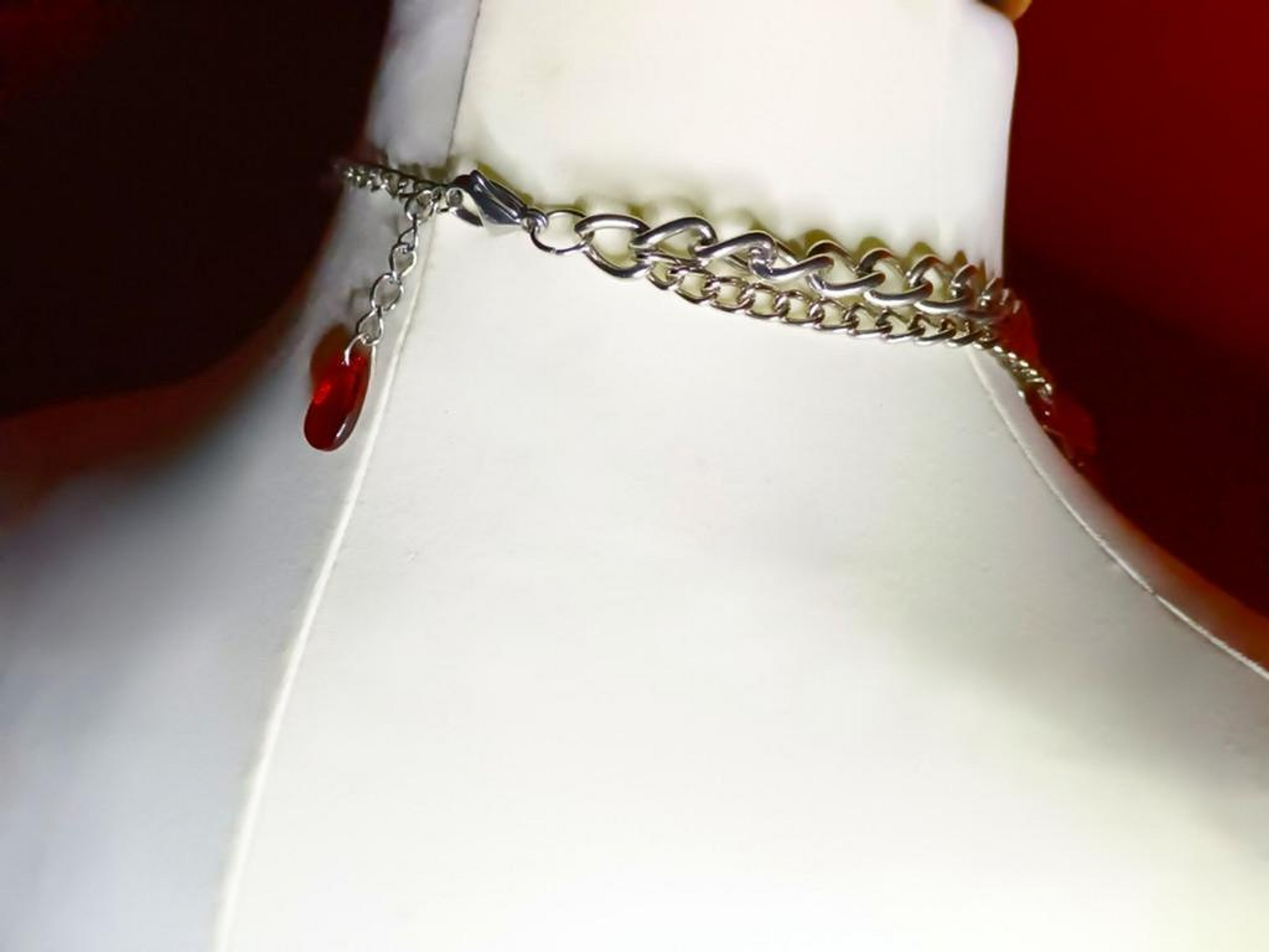 Made with different size stainless steel chains and O-rings, decorated with ruby red beads and little stars.